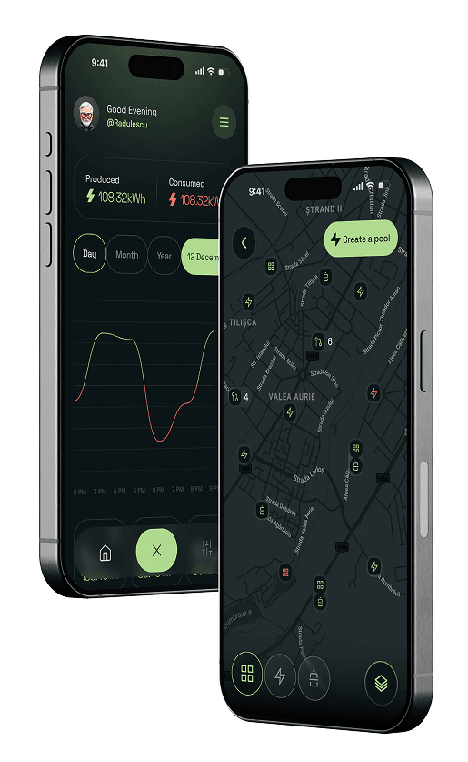Browse energy pools on a list or map. Inspect policy rules, participant lists, and kWh contributed over time; compare communities with sort, search, and policy filters.